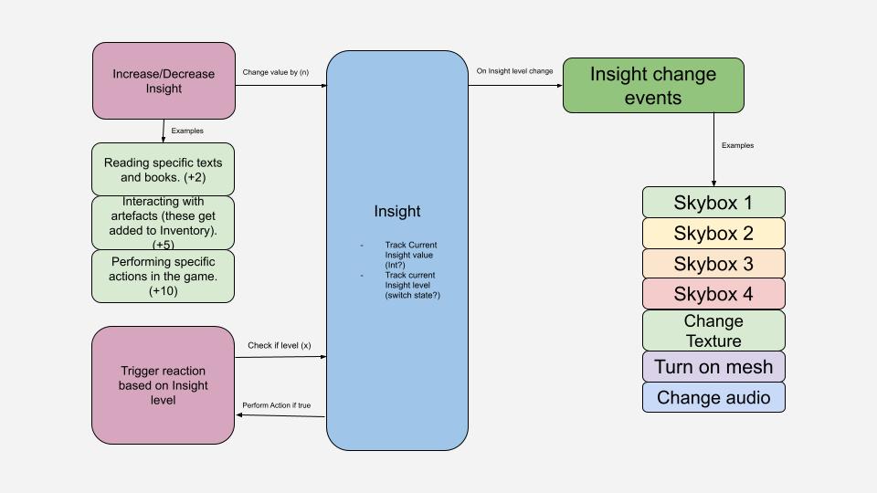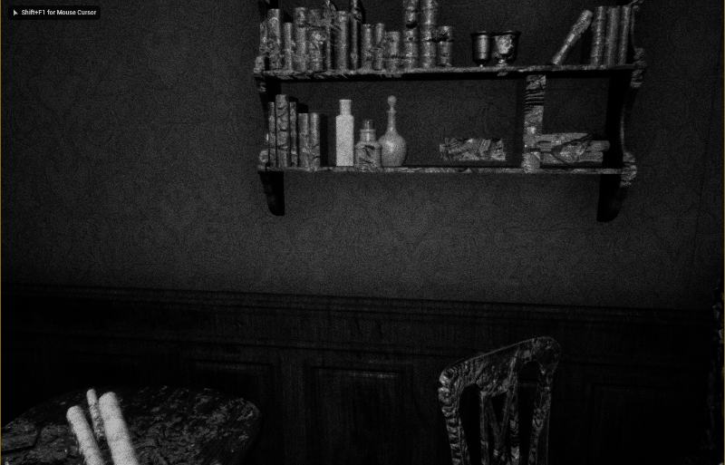 Working with our lead artist who was just learning to explore materials and materials instances in Unreal we created a system to have a ‘creep’ spread across the walls and furniture as the players level of ‘Insight’ increased.